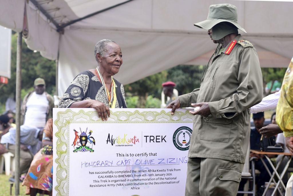 President Museveni awarded a few of the trekkers for successful finishing the 195kms of the trek, among which was Lieutenant General Nalweyiso Proscovia.