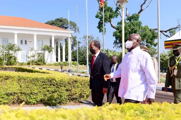 The Somali Head of State was accorded a 21-gun salute. He also inspected a guard of honour mounted by the Uganda People’s Defence forces.