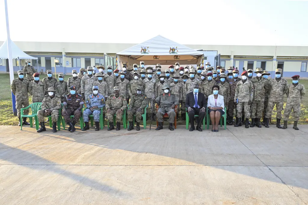 Present at the pass-out ceremony were the Minister of State for Defense, Hon. Jacob Oboth Oboth; the Deputy Chief of Defense Forces, Lt. Gen. Peter Elwelu; and the Senior Presidential Advisor on Defense and Security, Lt. Gen. (Rtd) Proscovia Nalweyiso, among others.